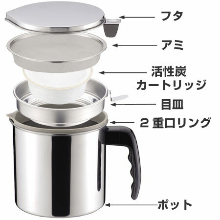 サイズ約 幅19.0×奥行14.0×高さ13.0(cm)重量:約440g内容量本体1個、活性炭カートリッジ1個材質本体、蓋、目皿:ステンレス鋼網:18-8ステンレス鋼2重口リング:66ナイロン(耐熱200度)ハンドル:フェノール樹脂(耐熱140度)活性炭:木質系活性布:不織布(レーヨン)カラー備考日本製商品区分その他調理用品カテゴリから探す●活性炭フィルターでろ過するので、細かい揚げカスや油の不純物やイヤなニオイもカット、キレイにこすことが出来ます!●活性炭カートリッジはくり返し使えるので経済的で環境にもやさしくエコです。